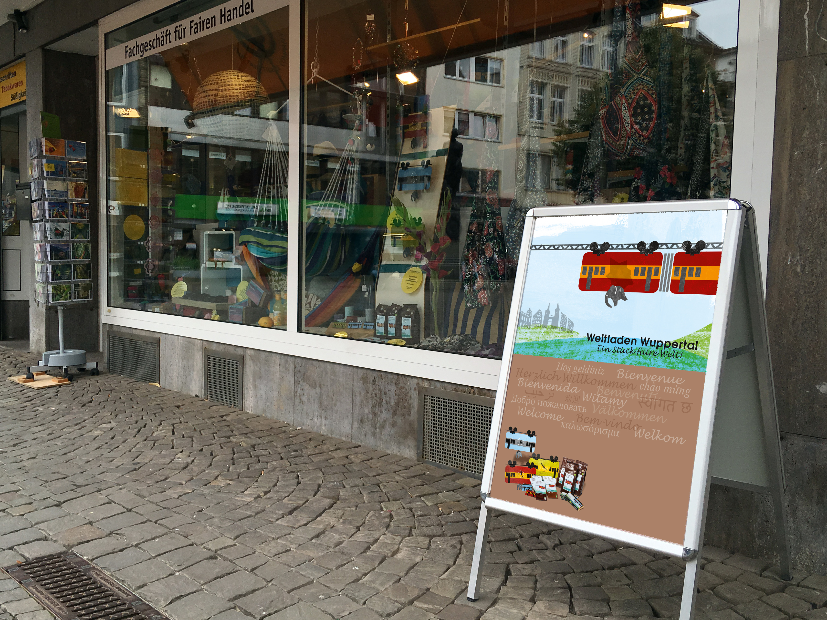 Illustration und Erscheinungsbild für Schwebebahn-Produkte, Mundo Fair – Weltladen Wuppertal.